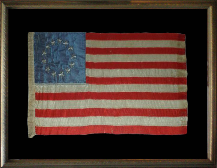 This lovely 1900 Cir, silk, American National Flag displays 13 hand- embroidered stars, exhibiting one of the most recognized and sought after star patterns on the American Flag, the “Betsy Ross” American National Flag. It is entirely hand-sewn by either Rachel Albright, Betsy Ross’ granddaughter or Sarah Wilson, her great granddaughter.