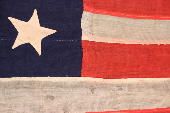 Rare 13 Star Small Naval Boat Ensign Flag, adopted by the US Navy around 1862 during the Civil War. Although the correct number of stars would have been 35 at the time, the Navy chose the simpler 13 Star, 4-5-4 Pattern so that they would not have to change the flag every time a new state was added to the Union. This flag proves rare, as few are found on the market today and especially striking is the unusual linear row placement. The small amounts of flags of this stature typically are known to display hand -sewn stars and canton, using thin wool as in this example. During the War, with the production of thousands of uniforms being made, wool became scarce creating an insufficient amount of wool available for flag making suggesting that flags would probable be repaired onsite whenever possible as likely displayed here. A similar example of this flag can be found in the Zaricor Flag collection.