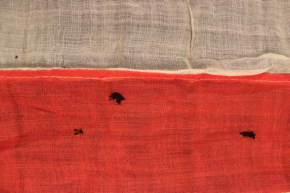 Size 47” X 69”; thin wool, machine stitched stripes in vermillion red and naval blue; 13 hand-sewn cotton, peek-a-boo stars arranged in 4-5-4 rows, on an uncommon 3- panel hand-sewn canton; letter W inscribed on the linen hoist that has two short rope hoist ties attached, strengthening panels in upper and lower edge on the hoist.