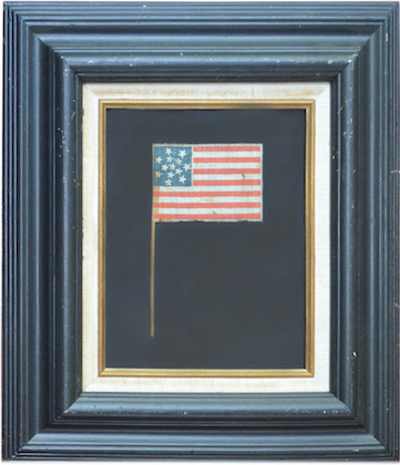 Frame size 17.25“H x 15.25 “L x 3 “ Thick, the flag presents itself beautifully while mounted on acid-free black cotton backing surrounded by an antique wooden frame painted black with a striking linen mat board and encased in UV protected glass.