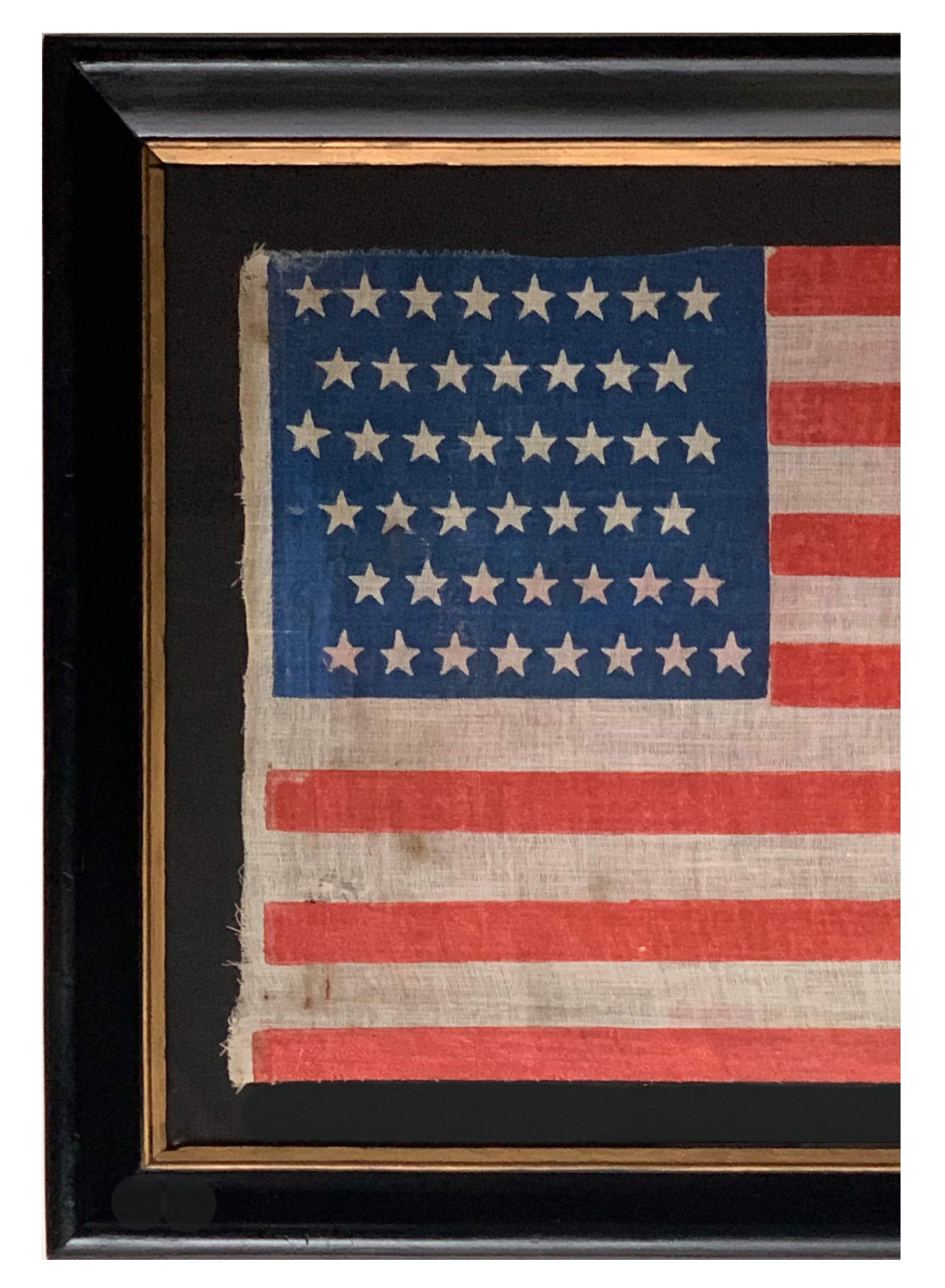 Antique 45-Star American parade flag, made of glazed cotton; the printed stars in the canton are arranged in a staggered pattern in lineal rows of 8-7-8-7-7-8, the 13 alternating red and white stripes represent the original 13 colonies. The colors are bold with a few areas containing slight discoloration, hoist and fly have some fraying, a few areas of fabric separation.