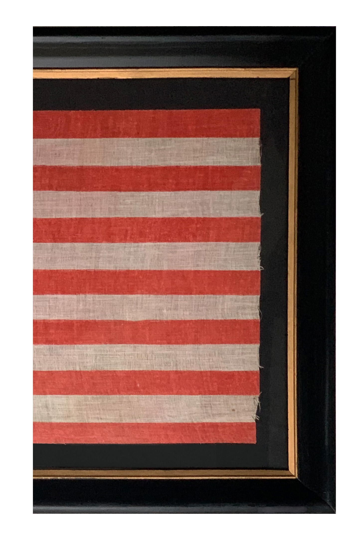 The flag is pressure mounted; pre-washed cotton fabric over acid-free cotton batting covering the backboard, surrounded by a vintage wood frame, enclosed with UV protected glass.
