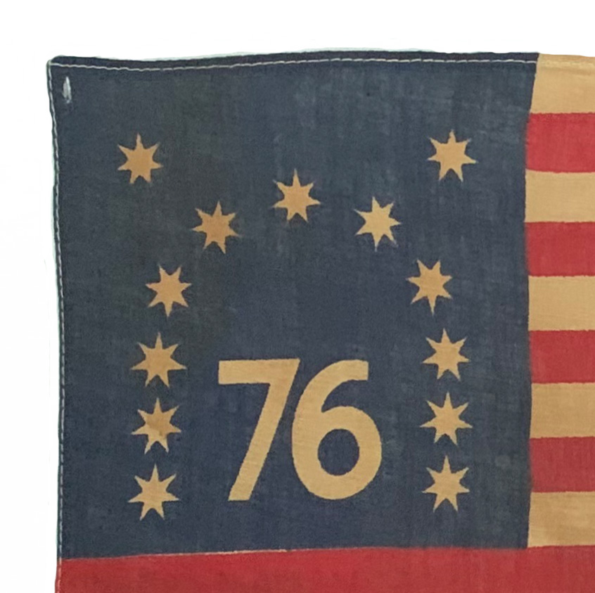 Flag is cotton; 13 stars with seven points printed in an arch over a large numerical ‘76’ and one star printed in the top left and right quadrants on an elongated blue canton; 13 red and white stripes symbolic of the 13 original colonies- beginning and ending with a white stripe. Very good condition; slight staining throughout mainly on the bottom left side, mid-bottom right side and #2 star left side; two ¼” vertical fabric separation top left and bottom left where the staff had been attached