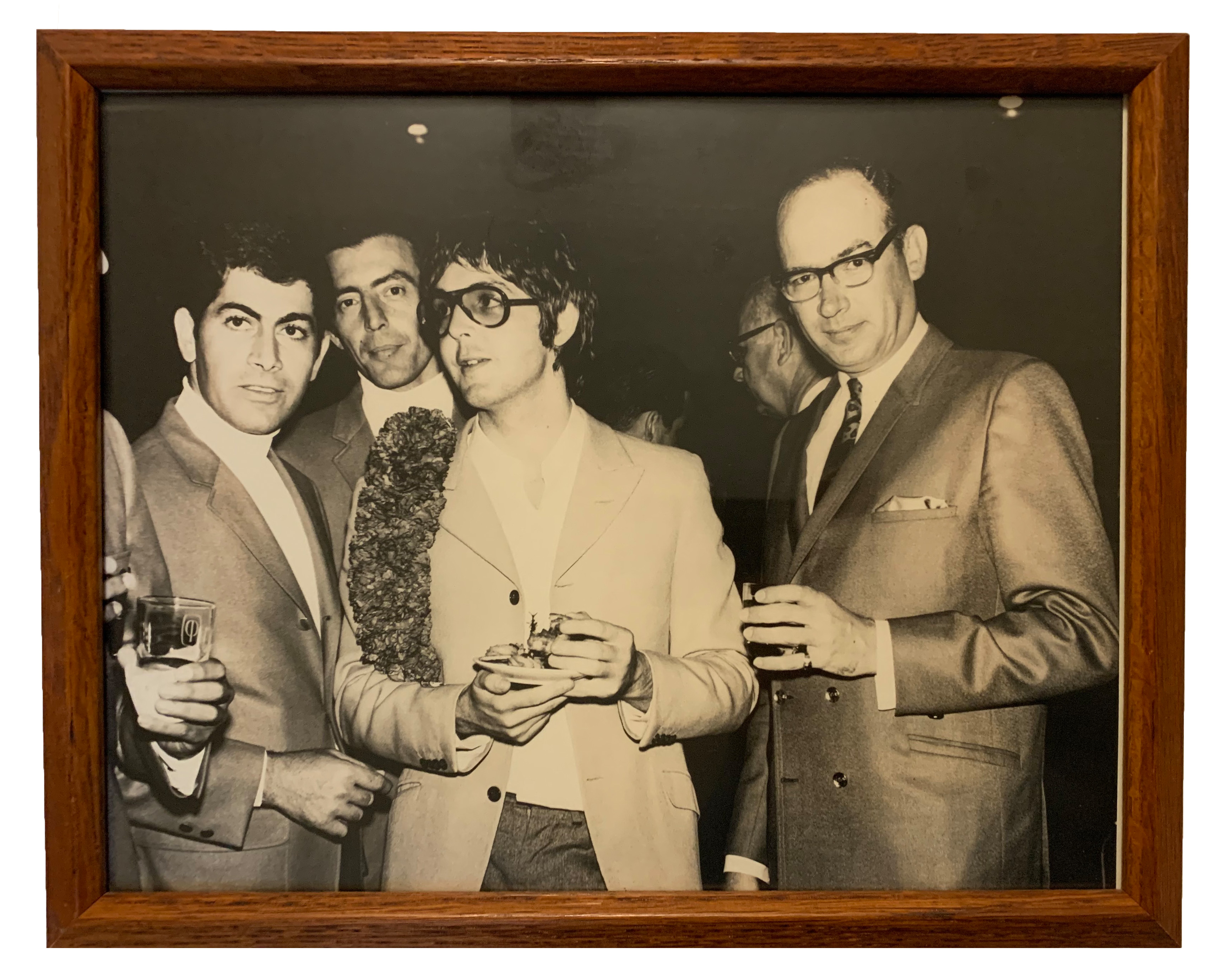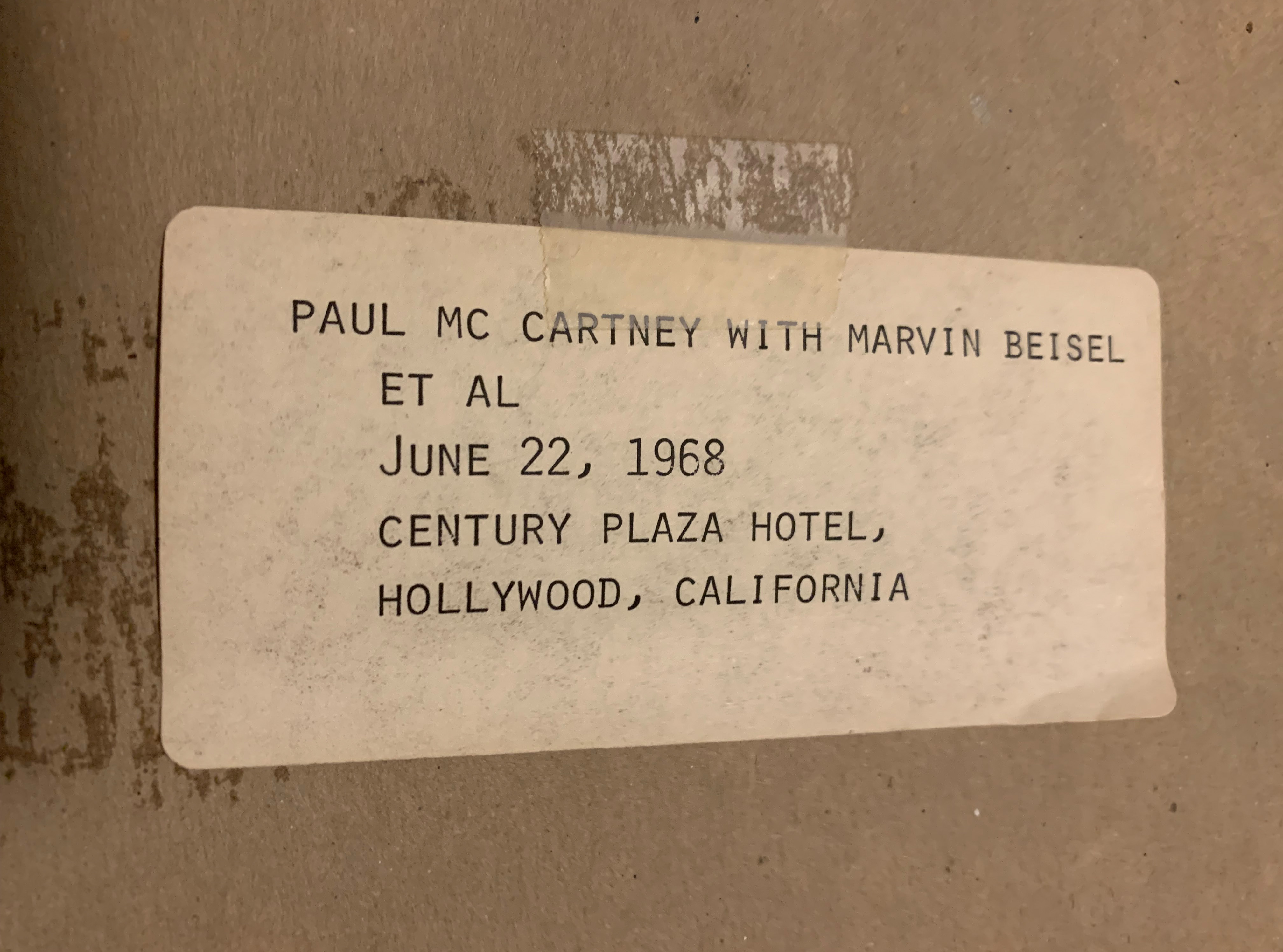 Also offered: two original photos; frame 12"x15" vintage color, similar to the smaller black and white picture in the frame; 2nd 12"x15" black and white photo of Paul McCartney, George Beisel; identifying label on the back dated June 22, 1968, Century Plaza Hotel, Hollywood, California.