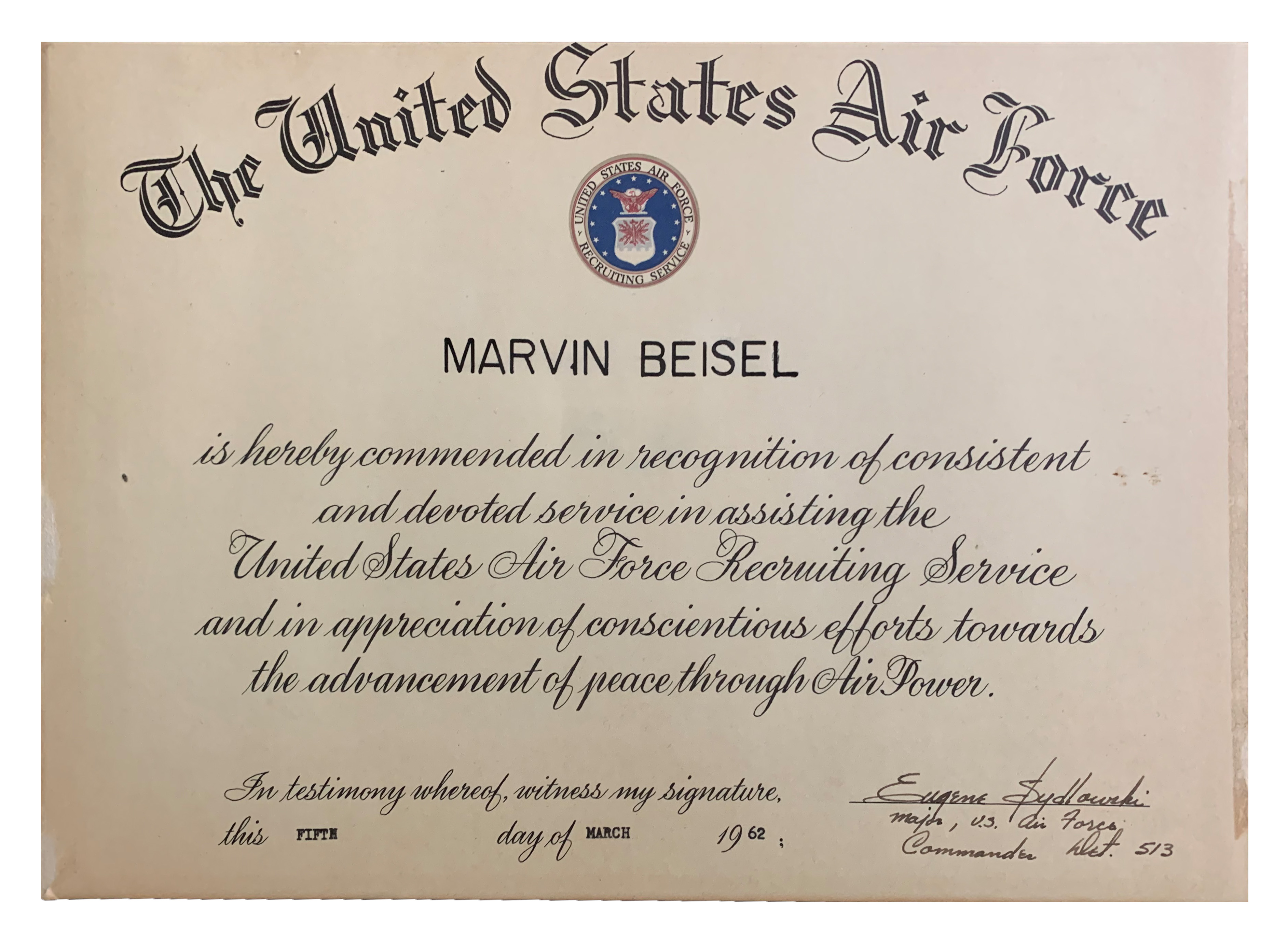 Also a United States Air Force Recruiting Office award to Marvin Beisel in recognition of his devoted service in the US Recruiting Office, 1962.