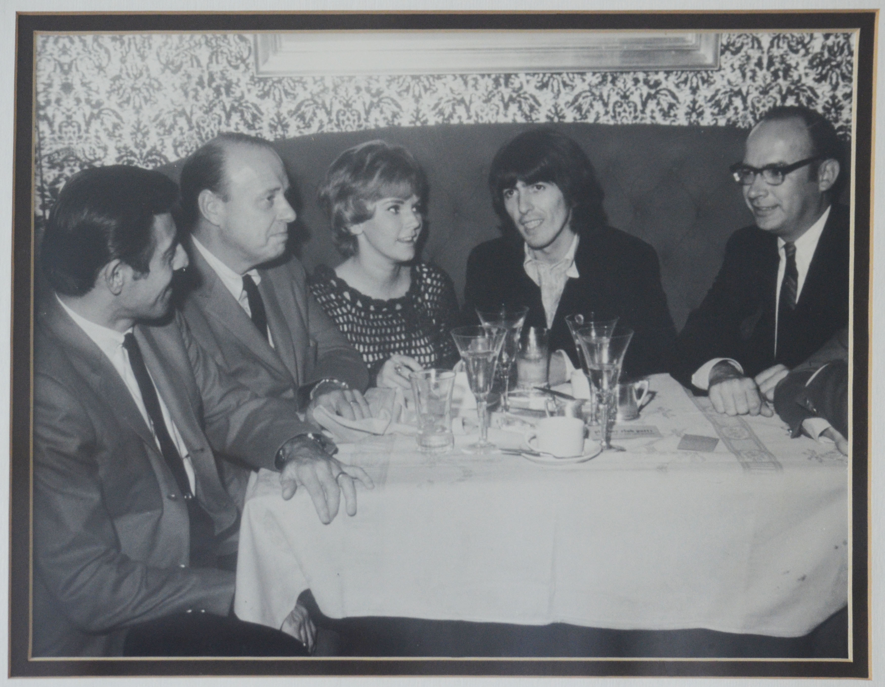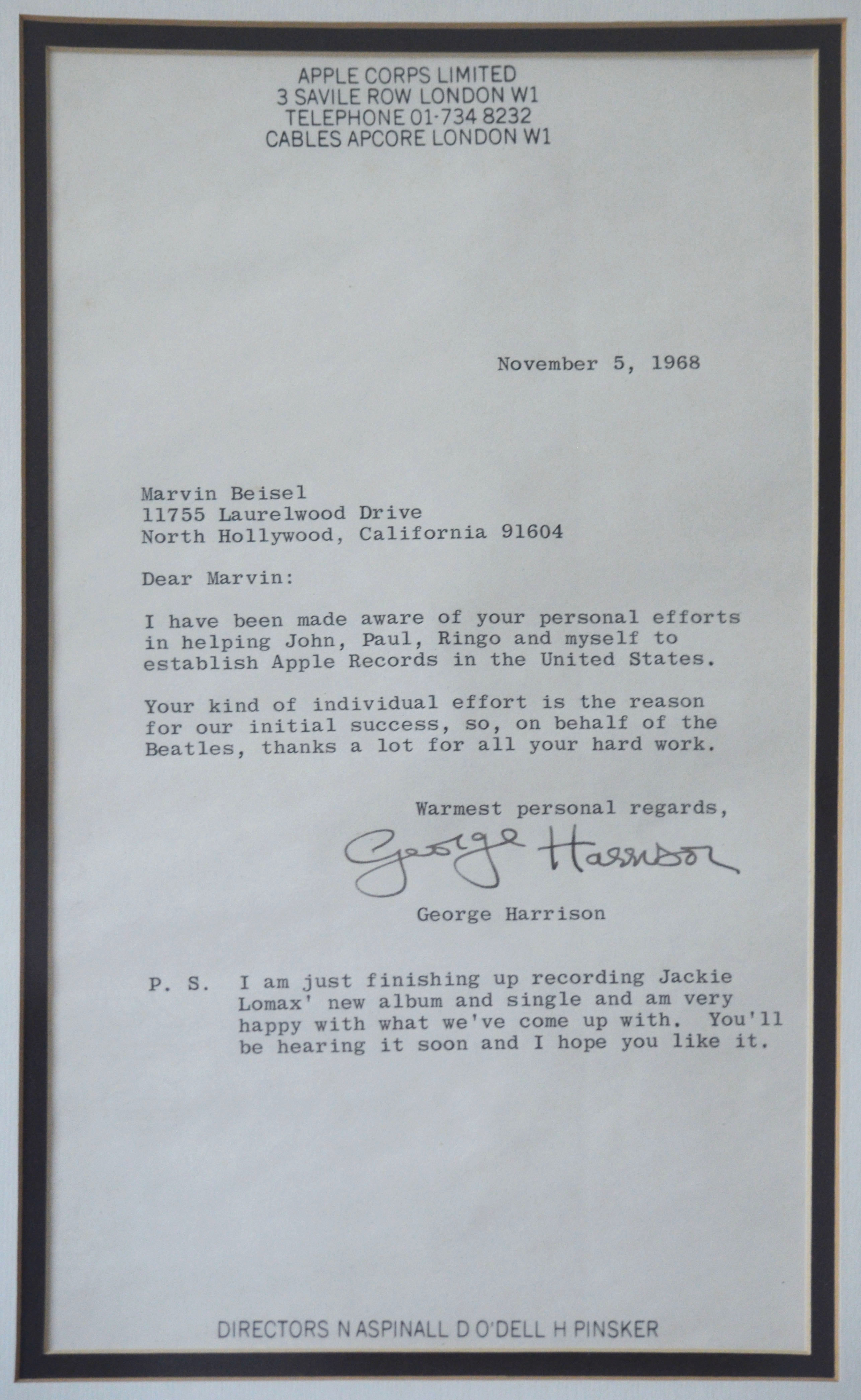 George Harrison personally signed letter thanking Capitol records executive Marvin Beisel, for his help establishing Apple Records in the United States for John, Paul, Ringo and George, dated 1968. Also included in the custom (HxL) 16 1/2"x22 1/2" vintage framing, is an original photo of Harrison seated in the center, Marvin Beisel to his right, and other Capitol Record executives on his left. The letter and picture in original mat and wood frame, in excellent condition.