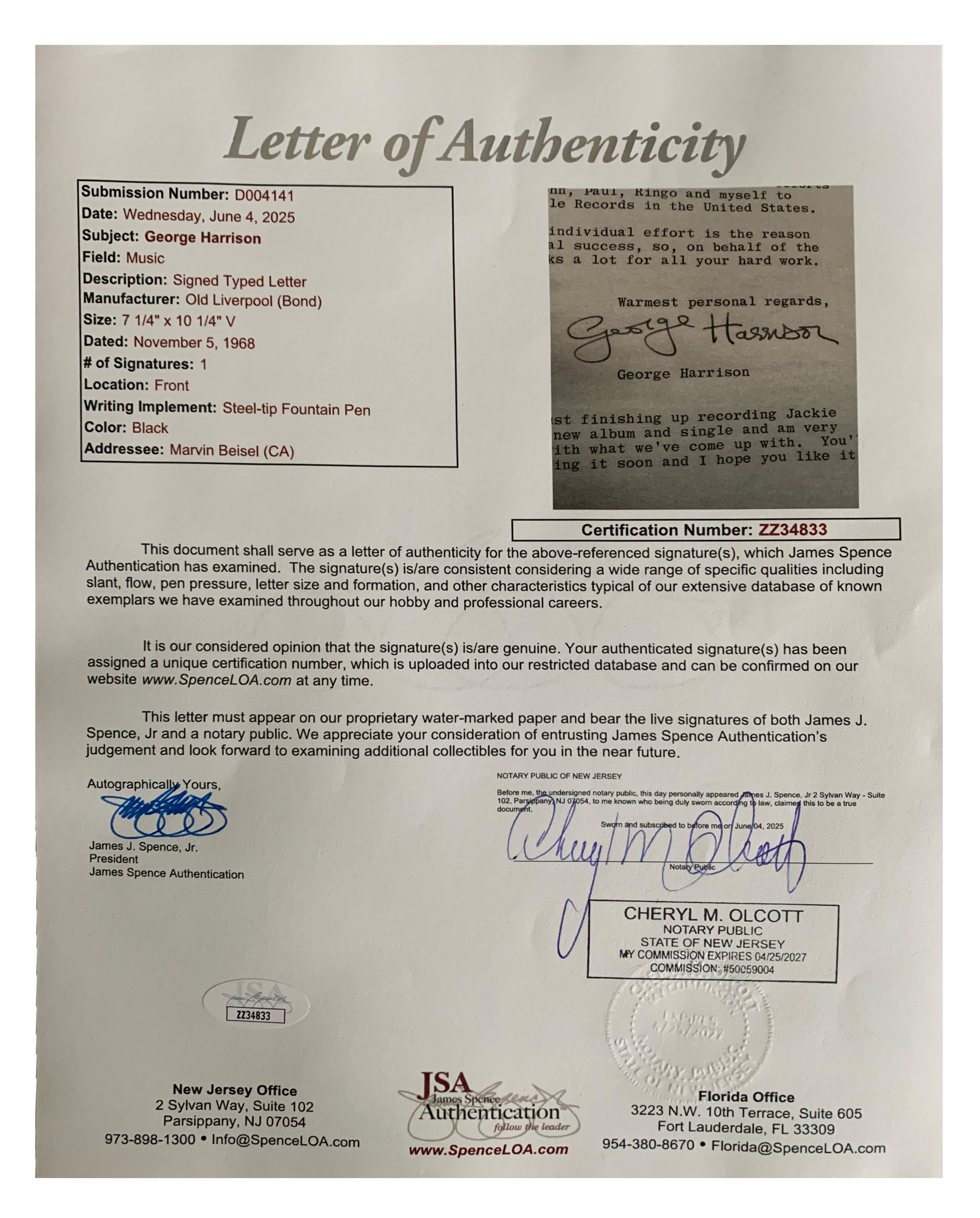 "The Beatles" George Harrison signed letter to Capital Records Nov 5, 1968