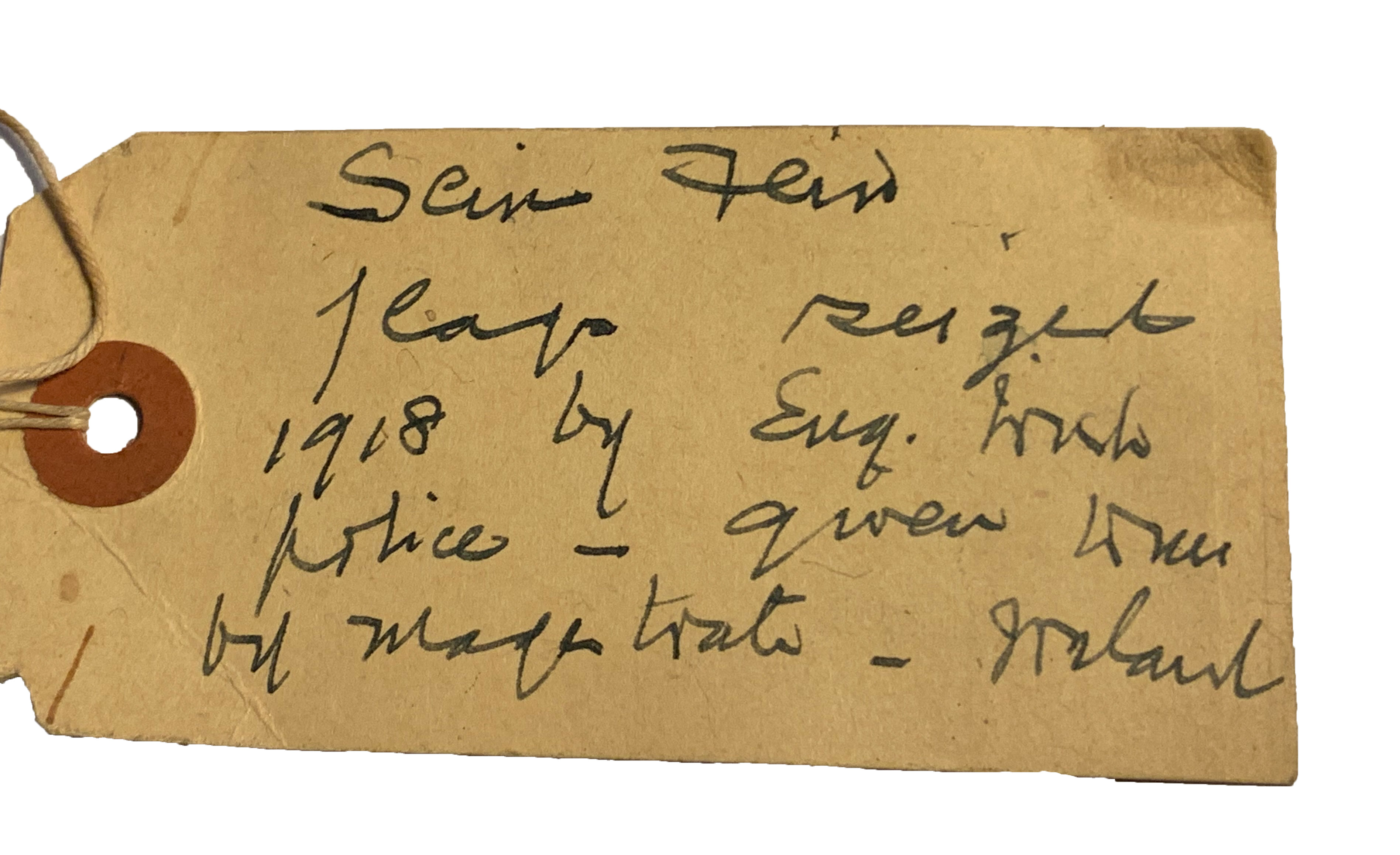 ID Tag Verification: the ID tag acquired with the flags, inscribed, further supports the authenticity of the item: "Sein Fein Flags seized 1918 by Eng. Irish, Police - given to me by Magistrate - Ireland."