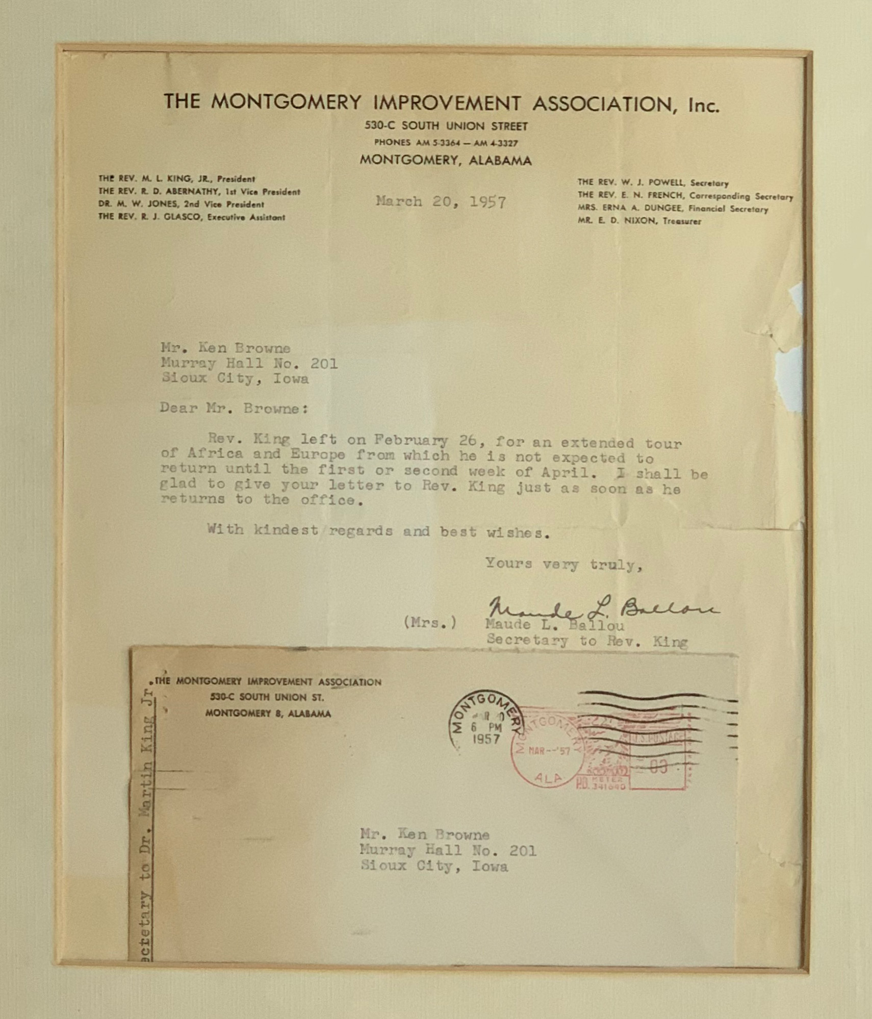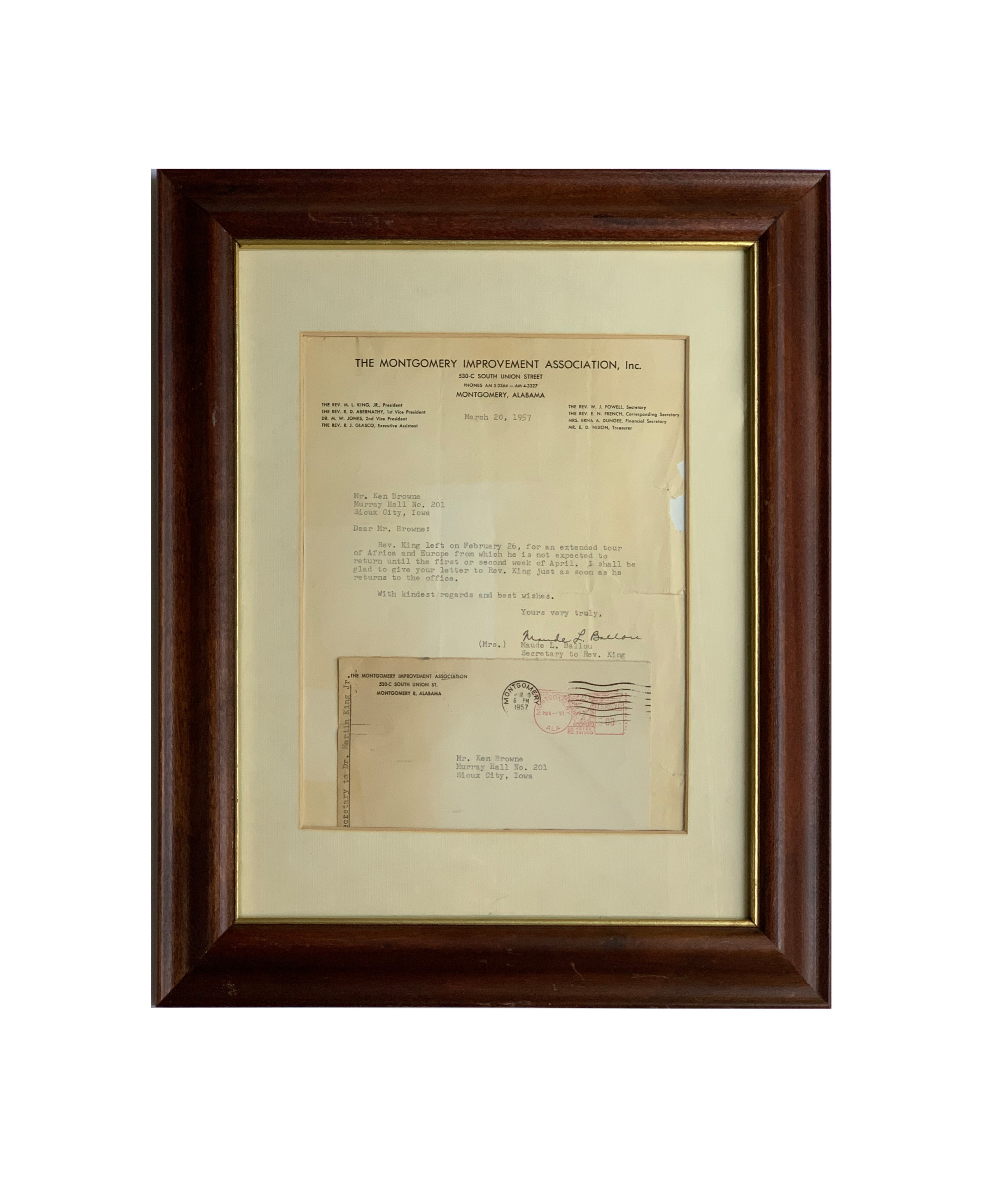 Offering a framed letter dated March 20, 1957 addressed to Ken Browne, a veteran who served in the military in Italy during WWII, received from the office of The President of The Montgomery Improvement Association Inc., The Reverend Martin Luther King Jr., signed on his behalf by his personal secretary Maude L. Ballou.
