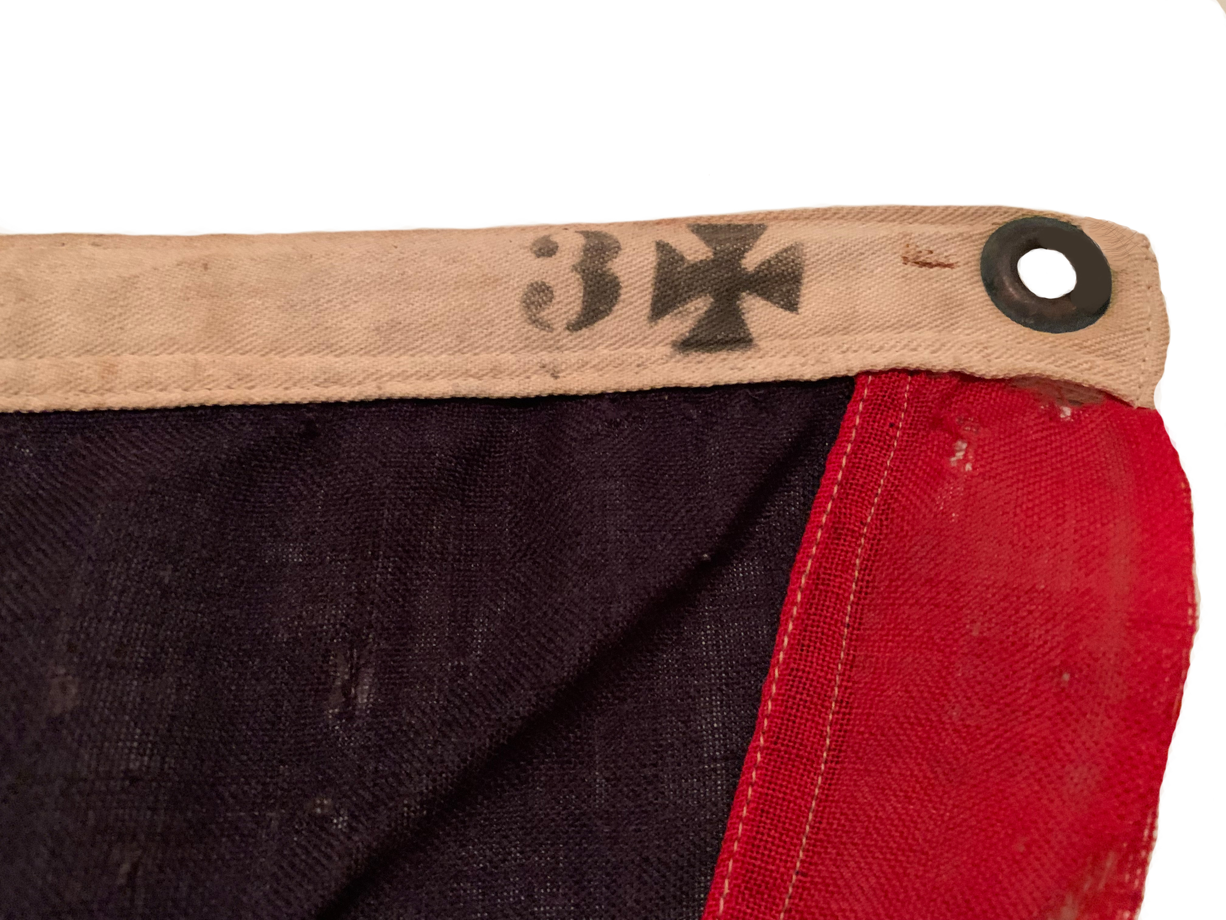 Condition is very good, areas of mothing throughout; colors are bold in navy blue and deep red; aged cotton lettering attached by zigzag stitching; linen hoist stamped with the number 3 and an ensign symbol, contains 2 brass grommets